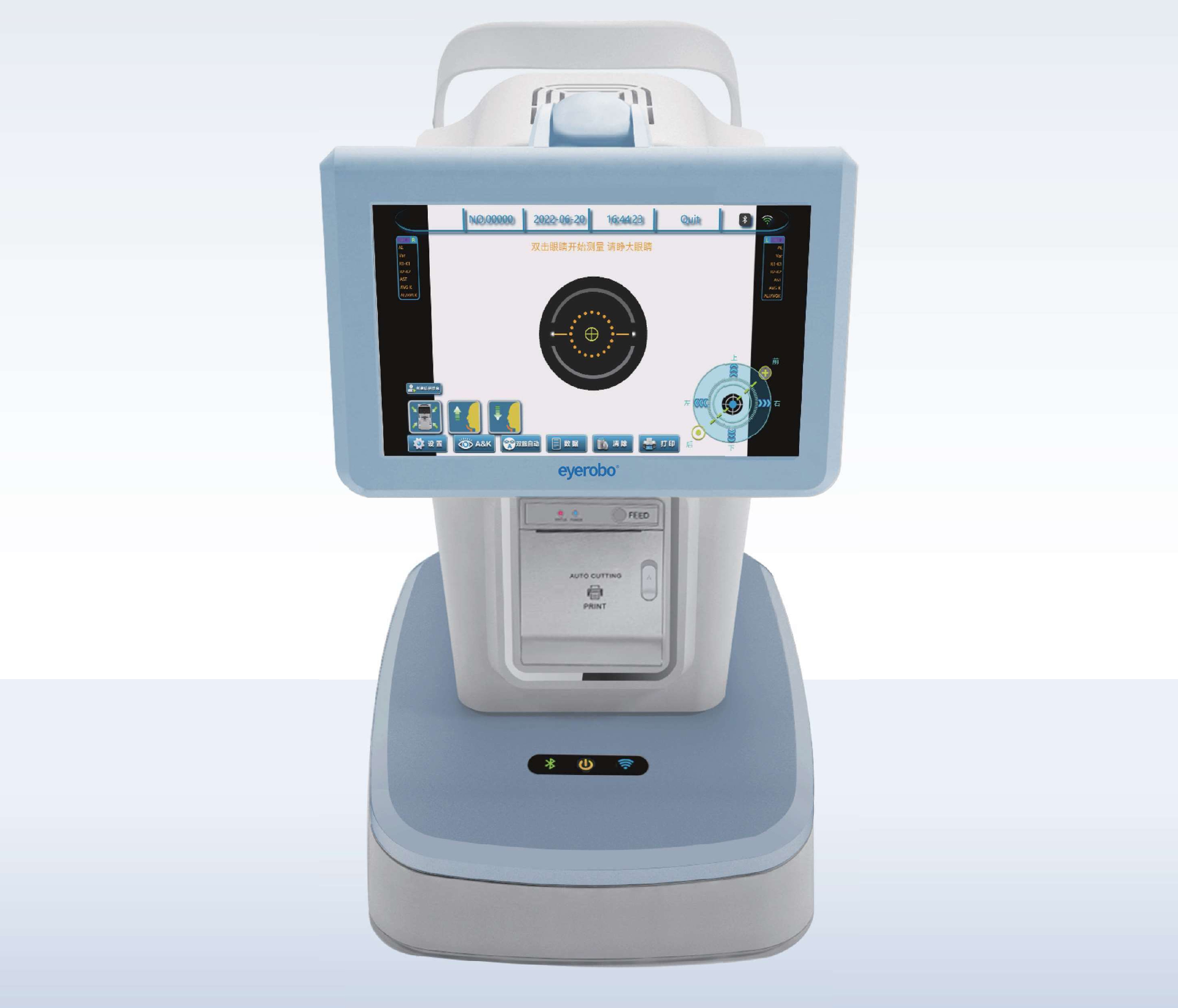 Measurement of axial length and corneal curvature of the human eye. Professional data output report. Supports direct printing via thermal or A4 paper printers. Built—in database for complete storage of patient examination results.